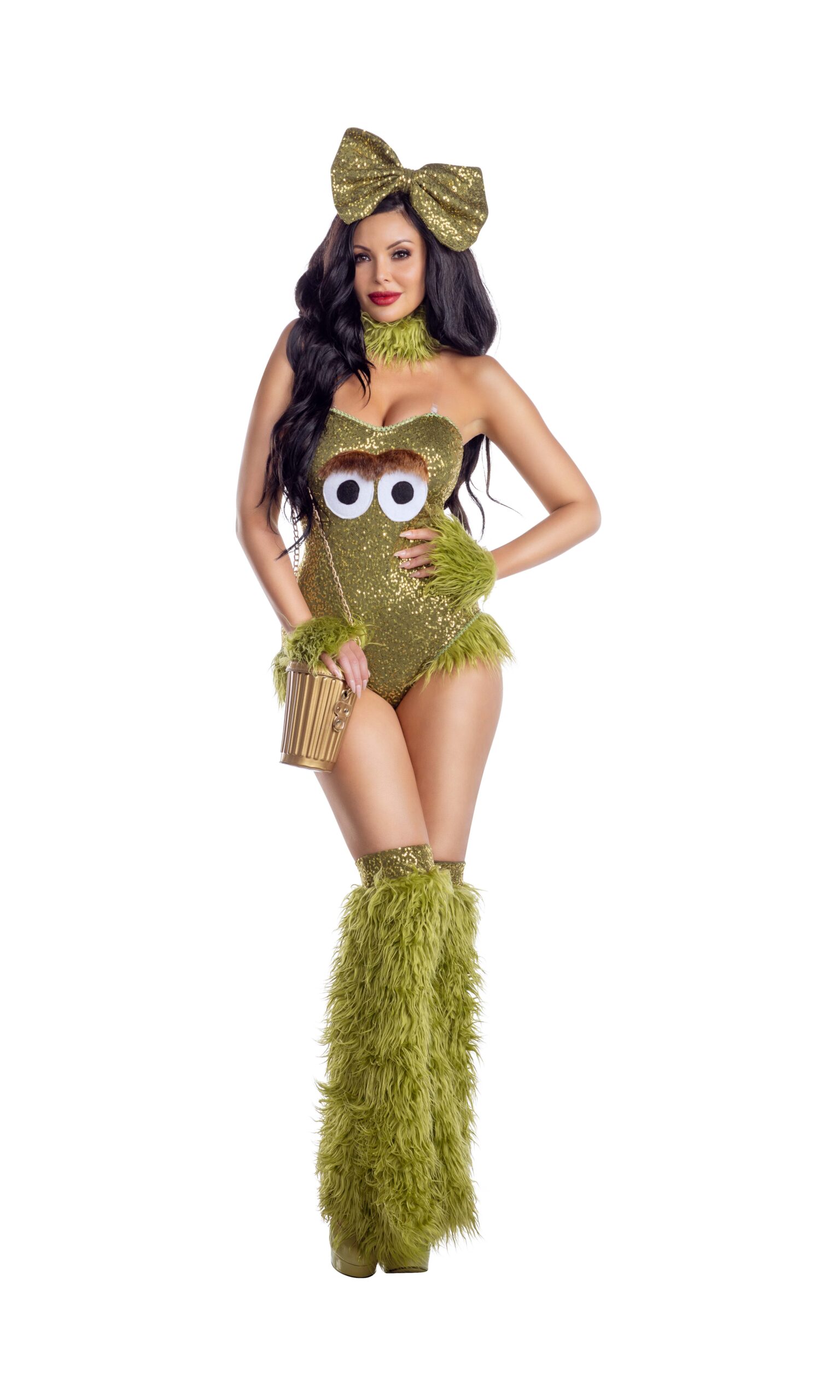 • Comes with matching furry leg warmers, headpiece, neckpiece, wristlets and trashcan purse