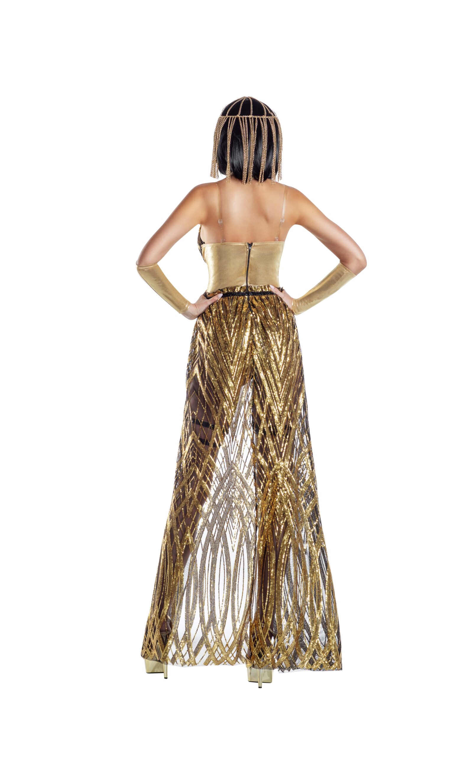 - Queen of the Nile gold teddy with gold sequin accents, built-in sequin skirt with ankh panels, attached garters and black sequin and gold trim accents